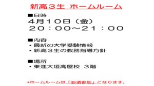 いよいよ新学年、新学期の始まりです。 受験生としての意識を持って、日々の学習総量を増やし、実力と得点力アップに励んでいきましょう。 月間HRは大垣高屋校の東進生は必ず出席してください。 内容は、大学入試のス […]